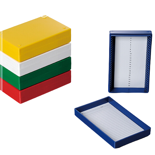Fabricadas en ABS, que no se afecta con la humedad. Guarda hasta 25 slides de microscopía de 1x3'' (25x75mm). Cada ranura está numerada. Cuenta con revestimiento interno con espuma para mayor protección. Las cajas son apilables.