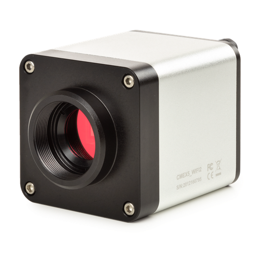 La cámara de CMEX-5 WiFi-2 está equipada con un sensor CMOS de 5MP con 12bits de conversión de escala de grises y una profundidad de color de 24bits. Esta cámara emite la imágen por WiFi codificado H.264 ofreciendo imágenes de alta resolución de manera simultánea a varios periféricos como pueden ser smartphones, tablets u ordenadores con sistemas operativos iOS, Android y Windows. La utilización de una cámara WiFi junto con su microscopio le permitirá compartir la información con varios usuarios sin la necesidad de utilizar complejas redes de datos.