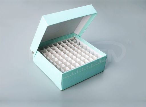 Separador de cartón con bisagra.Fabricado en cartón duradero con un recubrimiento blanco exterior superior: Resistente químicamente a alcoholes y solventes orgánicos suaves.Las Cajas Congeladoras Blancas de Cartón Premium tienen un recubrimiento brillante.Las cajas de congelador de 2 pulgadas sostienen tubos criogénicos de 1.5 ml o 2 ml.Temperatura de trabajo: estable desde -196°C hasta 121°C.Adecuado para congelación en nitrógeno líquido (después de agregar agujeros de ventilación).