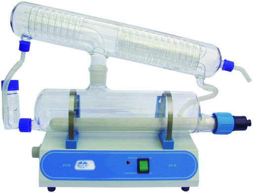 Equipo completo en vidrio borosilicato de funcionamiento automático y producción continua.Produce una destilación de alta pureza, libre de pirógenos e iones metálicos.Equipado con elemento calefactor en cuarzo y dispositivo de protección, mediante presostato de seguridad, que se acciona en caso de falta de agua de alimentación al refrigerante y calderín de ebullición, con reactivación automática cuando el suministro es suficiente.Dispositivo para colgar en pared.