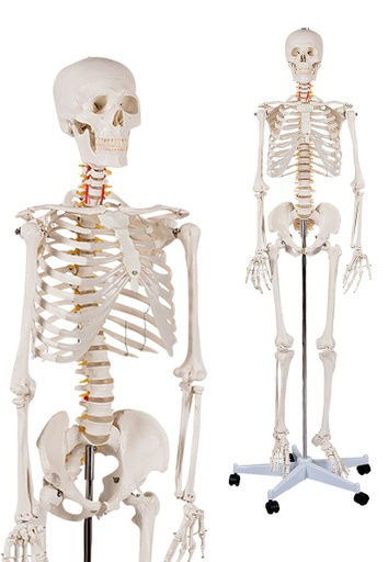 El cráneo incluye mandíbula móvil, bóveda craneal, líneas de sutura y 3 dientes inferiores extraíbles.