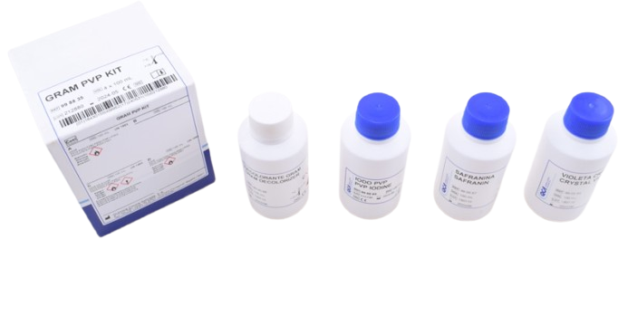 Familia de productos sanitarios para diagnóstico in vitro destinado a la diferenciación de bacterias Gram positivas y Gram negativas en bacteriología utilizando el método diferencial de Gram. Son colorantes cualitativos que dan información sobre el estado fisiológico o patológico de la muestra de tejido cuando la tinción obtenida es interpretada por profesional cualificado. Para obtener un diagnóstico, los resultados se han de evaluar en el contexto de los antecedentes médicos, el estado físico y el resto de datos clínicos y de laboratorio obtenidos. Para uso profesional de laboratorio.
