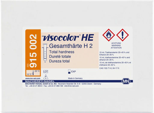 Kit de ensayo de titulación para la determinación de la Dureza Total. Visocolor HE Dureza total H 2 es altamente sensible y preciso debido a la jeringa especial de valoración.