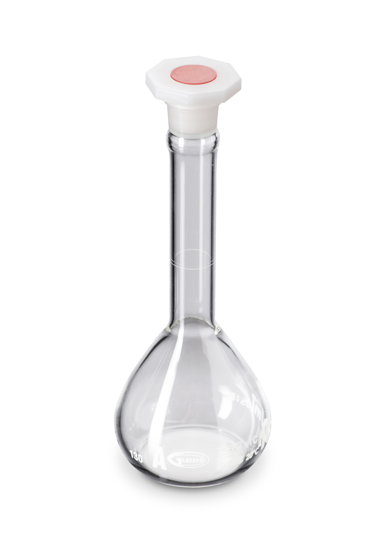 Matraz volumétrico clase A en vidrio de borosilicato con tapón PP. Tiene aforo marcado con diamante en el cuello y decorado en esmalte blanco cerámico.
