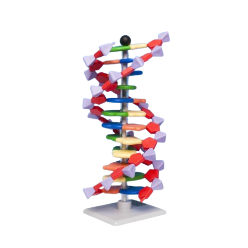 El sistema avanzado miniDNA® comprende partes codificadas por colores en forma de abstractos diseñados para representar las bases nitrogenadas, el azúcar pentagonal y el fosfato piramidal componentes necesarios para hacer un modelo de doble hélice del ADN. Los tres enlaces de hidrógeno que conectan citosina a la guanina y los dos que se conectan a la adenina timina están representados por el número apropiado de clavijas.