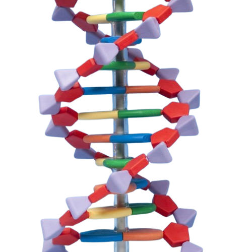 Incluye 11 Timina (T) (anaranjado), 11 Adenina (A) (azul), 11 Guanina (G) (verde), 11 Citosina (C) (amarillo), 44 Desoxirribosa (rojo) y 44 Fosfato (violeta).
