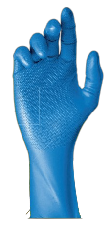 Guante de seguridad fabricado con goma nitrílica, con revestimiento tipo "fish scale grip" y antideslizante en la palma y las puntas de los dedos internamente, con un diseño anatómico y adecuado para ambas manos.