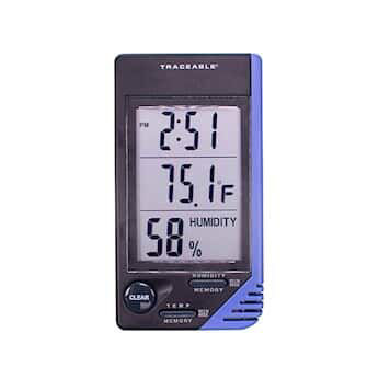 Simultáneamente muestra la hora, temperatura y humedad. Incluye Certificado de Calibración con trazabilidad NIST. Registra valores máximos y mínimos.