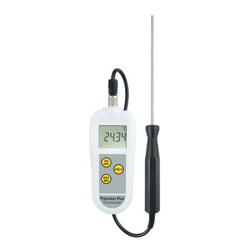 Termómetro de alta precisión - Precision Plus. Rango de medición: -200°C a +200°C. Resolución: 0,01°C. Exactitud: ±0,05°C (-200°C a 300°C) y luego ±0,2°C. El Precision Plus se suministra con una sonda PT100 1/10 DIN. Calibración acreditada ISO 17025 incluida