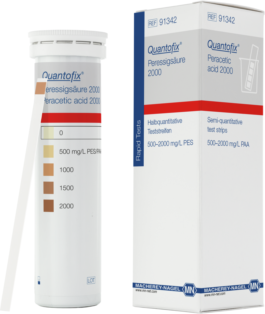 Tiras reactivas semicuantitativas para la determinación del ácido peracético. Ideal para un análisis rápido y sencillo del ácido peracético directamente in situ. Puede utilizarse con el lector de tiras reactivas Quantofix Relax.