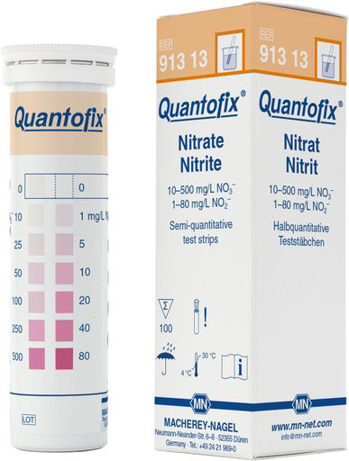 Tiras reactivas semicuantitativas para la determinación de Nitrato y Nitrito. Ideal para un análisis rápido y sencillo de Nitrato y Nitrito directamente en el lugar. Puede utilizarse con el lector de tiras reactivas Quantofix Relax.