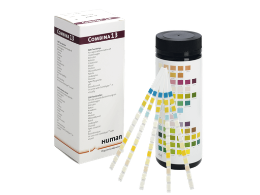 Tiras reactivas de orina para medir entre 3 y 13 parámetros.Perfil urinario exhaustivo, incluyendo microalbúmina y creatinina. Especialmente indicadas para la obtención de muestras de orina iniciales; no requiere recogida programada.Combilyzer13 calcula automáticamente la relación entre albúmina y creatinina, tiene control visual semicuantitativo de todos los parámetros en 60 segundos y control visual y análisis automatizado en: Combilyzer13.