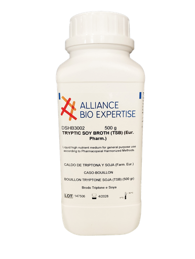 El TSB (Tryptic Soy Broth) de Bio Alliance Expertise es un medio de cultivo líquido versátil y altamente nutritivo, diseñado para el crecimiento y mantenimiento de una amplia variedad de microorganismos. Este caldo es ideal para aplicaciones generales en microbiología, proporcionando un entorno rico en nutrientes que favorece el desarrollo óptimo de bacterias tanto gram positivas como gram negativas.